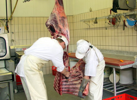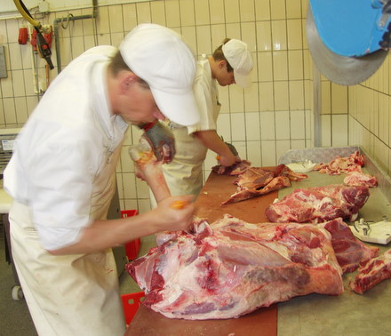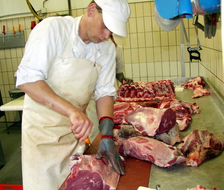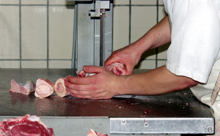Nach dem Entbeinen werden die Teilstücke vom Fett und Sehnen befreit. Das Fleisch wird ladenfertig zugeschnitten. Auf dem Bild wird eine Sehne von der Unterschale abgetrennt.