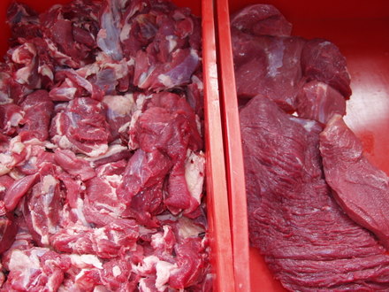 Das Fleisch wird nach Klassen sortiert. Links sehen sie die Sortierung R 3 für Hackfleisch und rechts ist die Sortierung R 1 für Gulasch.