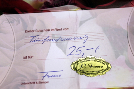 Also, da habe ich heue Abend beim „Kasse machen“ doch laut gelacht!  Es lag im “50.-Euro Fach” ein Gutschein mit einem „Blumenmotiv“. Das machte mich stutzig. Als ich die Karte öffnete sah ich sofort, woher sie kam. Sie kam zwar von einem Geschäft Freese, aber von Paul Freese! Mein Onkel Paul hatte bis vor einigen Wochen ein Geschenke- Fachgeschäft. (ist nun Rentner)